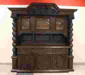 Piękny i olbrzymi kredens w stylu gdańskim. Mebel dostojny, rzec by można pałacowy. W każdym razie przeznaczony do dużego pomieszczenia, w którym stanowić będzie ozdobę - w niewielkim bądź małym pomieszczeniu zostanie przytłoczony, tracąc jednocześnie swój urok. Bogactwo zdobień, wśród których prym wiodą spiralne filary bardzo charakterystyczne dla Mebli Gdańskich. Fronty drzwi ze snycerskimi ozdobami, szyby fazowane, przepięknie dekorowana korona kredensu. W dolnej części dwie szafki - lewa z trzema szufladami, prawa z jedną długą półką. Powyżej trzy szuflady oraz trzy wysuwane blaty. Okucia i zamki oryginalne.