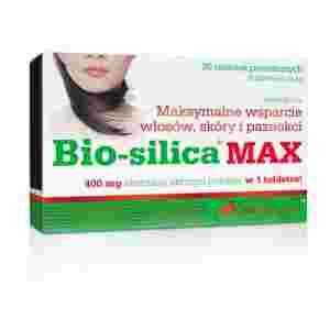 Bio-silica® MAX to suplement diety w postaci tabletek powlekanych zawierający wysoką dawkę skrzypu polnego, standaryzowanego na zawartość krzemionki, która podobnie jak cynk, pomaga utrzymać właściwą kondycję włosów, skóry i paznokci. Preparat zawiera również ekstrakt pokrzywy, cystynę, a także kompleks witamin i minerałów.