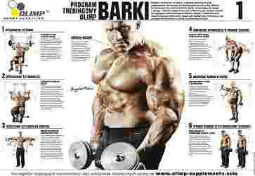 Potężne barki to jedna z najbardziej widocznych grup mięśniowych i stanowi wizytówkę nie jednego kulturysty. Tablica przedstawia ćwiczenia, które poruszą wszystkie aktony mięśni naramiennych. Sześć szczegółowo opisanych i zilustrowanych ćwiczeń m.in. unoszenie sztangielek bokiem, wyciskanie sztangielek siedząc, czy wznosy barków ze sztangielkami (szrugsy). Zadbaj o wszechstronny rozwój tej grupy mięśniowej z programem treningowym Olimp.