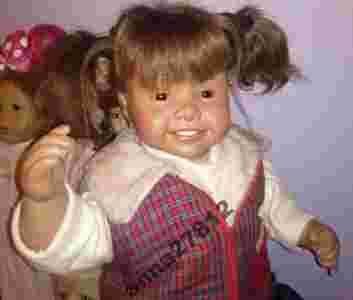lalka ma około 74 cm wysokości * Brązowy ludzki włos- peruka(włoski można myć ,czesać) * Brązowe szklane oczy z Lauscha (struktura przypominają ludzkie) Głowa, ręce i nogi wykonane z twardego winylu lala nosi letnie ubranka Ciało materiałowe nadziewane szkieletem dzięki temu lala przyjmuje różne pozycje potrafi sama stać,siedzieć