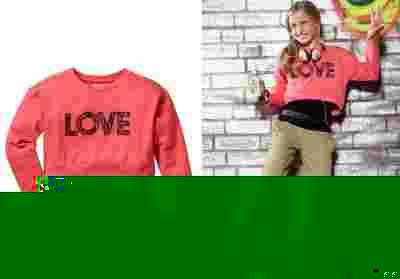 Krótka, luźna modna bluza. Z długim rękawem i okrągłym dekoltem. Z przodu czarny koronkowy napis 'LOVE'.