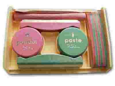 4.Aby zabezpieczyć składniki zawarte w paście i pozwolić im wnikać w płytkę paznokcia należy nanieść niewielką ilość pudru z różowego pojemnika na różową polerkę z jelonka i należy postępować tak samo jak w punkcie 3.