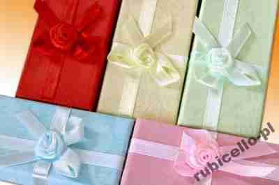 Opakowanie ozdobne wykonane z wysokiej klasy kartonu, dwuelementowe. Opakowania są koloru ecru, czerwonego, zielonego, niebieskiego, różowego. Dodatkowo ozdobione satynową wstążeczką.