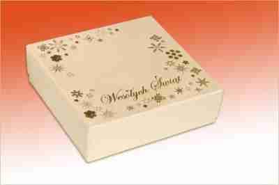 Opakowanie ozdobne wykonane z wysokiej klasy papieru ozdobnego gramatura 250 g papier barwiony, dwuelementowe, nadruk z motywem świątecznym wykonany metodą hot printu.