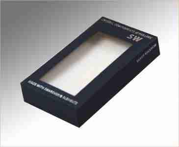 Opakowanie Swarovskiego dwuelementowe - pokrywka wykonana z wysokiej jakości katronu eurepejskiego gramatury 300 g o strukturze delikatnego prążka w kolorze granatowym z okienkiem. Spód biały gładki karton gramatury 300g- z wkładem gąbkowym wykończonym welurem z nacieciami jubilerskiemi. Doskonałe pudełeczko na kolczyki, komplety, zawieszki.