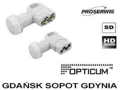 Czterowyjściowy konwerter typu quattro (tzn. rozdzielone polaryzacje V i H dolnego i górnego pasma).