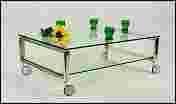Wyjątkowo elegancka i efektowna ława - stolik o bardzo modnej i charakterystycznej stylistyce lat 70-tych. Solidna i stabilna konstrukcja ławy wykonana ze stali chromowanej u dołu z funkcjonalnymi kółkami pozwalającymi dogodnie przemieszczać mebel w zależności od potrzeb ponieważ całość jest dość ciężka ze względu na grube szklane blaty wykonane z bezpiecznego hartowanego szkła i solidnie przymocowane za pomocą śrub do konstrukcji. Stolik w dobrym stanie idealnie dopasuje się do każdego wnętrza.
