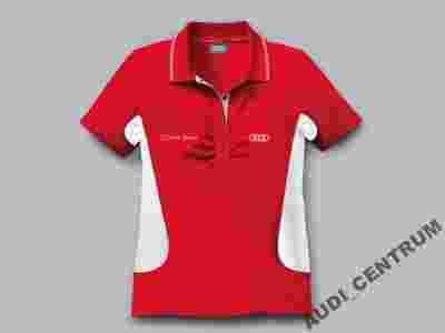 Koszulka idealna dla wysportowanych podążających za moda kobiet. Polówka w kolorze czerwonym z dwoma białymi pasami po bokach podkreślającymi talię. Pierścienie Audi wyhaftowane po lewej stronie koszulki, natomiast logo Audi z prawej strony. Kołnierzyk ma dwa cieniutkie białe paski, połączony z dekoltem zapinanym, na zatrzaski.