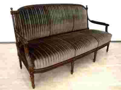 Szczególną uwagę przykuwa zaplecek bezpośrednio przechodzący w zdobione w liście akantu podłokietniki wyściełane materiałem. Nogi zwężające się ku dołowi, żłobkowane są zakończone kostką z rozetami.