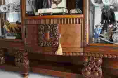 Drodzy Państwo mam przyjemność zaoferować wyjątkową i okazałą Witrynę secesyjną. Witryna ta to wielkie i wyjątkowe dzieło sztuki tamtego okresu. Mebel został wykonany w okresie około 1900 roku z secesyjnymi elementami, w pełni z drewna dębowego wraz z rzeźbami. Wszystkie elementy rzeźb na tym meblu zostały wykonane ręcznie i wkomponowane w całość. Witryna została wspaniale zaprojektowana i wykonana z wielką dbałością o szczegóły, funkcjonalność i dekorację. Środkowa część witryny stanowi idealne miejsce do wyeksponowania zegara zaś w części bocznej znajdują się witryny z lustrami co pozwoli również Państwu wyeksponować dużą ilość porcelany i szkła. Mebel ten pod blatem posiada dodatkową szafkę. Blat pokryty jest jasnym marmurem. Witryna ta znajduję się jak widać na zdjęciach w wyśmienitym stanie i są godna polecenia. Do wyjątku należą tak wspaniałe okazy i w takim wykonaniu.