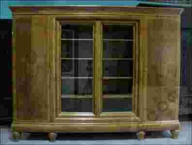 Orzechowa biblioteka Art Deco, drzwi boczne z pięknymi wstawkami z czeczoty orzechowej okraszone intarsją. Przeszklone drzwi ze szlifowanymi szybami, bryła mebla wsparta na równie pięknych, ośmiokątnych nogach.
