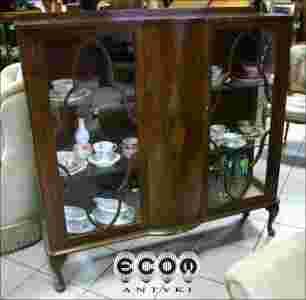 Witryna o prostokątnym przekroju fornirowana orzechem, trójstronnie przeszklona. Dostęp do ekspozycji zapewnia para drzwi rozdzielonych w środkowej części. Wewnątrz dwie obszerne półki. Blat wyłożony jednym liściem forniru, pomiędzy drzwiami, użyto czterech tworząc ciekawy wyglądu mebla.