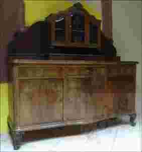 Orzechowy kredens z okresu międzywojennego, bryła mebla wsparta na giętych nogach dodających lekkości. Środek dolnej części wysunięty ku przodowi, za drzwiami jedna przestrzeń bez ścianek działowych. W górnej części nadstawka ze szlifowanymi szybami.