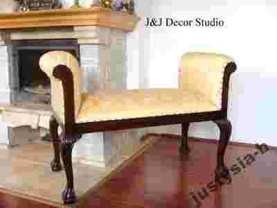 Przedmiotem aukcji jest przepiękna otomanka wykonana w całości z litego drzewa mahoniowego w kolorze ciemnobrązowym (ciemny kasztan delikatnie przechodzący w mahoń). Elegancja, szyk, klasyka. Lite drewno, tapicerka wykonana z eleganckiego materiału obiciowego. Otomanka jest bardzo solidnie i precyzyjnie wykonana. Tapicerka jest uzupełniona złotymi nitami, co sprawia, że wygląda on bardzo elegancko. Produkt jest nowy.