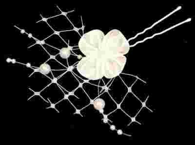 Stroik wykonany jest z atłasowego kwiatka, zdobiony perłami i tiulem woalkowym.