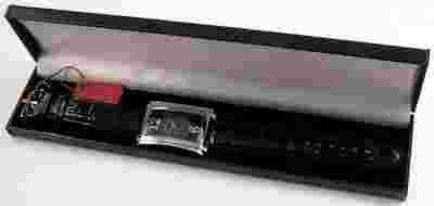 Pudełko do zegarków na zewnątrz oklejone jest czarną dermą. W środku wyłożone czarnym aksamitem, a denko wykończone jest od wewnątrz białą dekoracyjna tkaniną. Poniżej kilka przykładowych zastosowań pudełka. UWAGA, przedmiotem aukcji jest pudełko, a użyte do zdjęć zegarki są tylko demonstracją jego zastosowania.