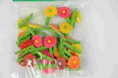 Uroczy komplet 24 drewnianych spinaczy z kwiatkiem. Pod spodem mały spinacz , pozwalający na przyczepienie ozdoby. Doskonałe jako dodatek do samodzielnie wykonanych kartek okolicznościowych. Podana cena dotyczy jednego opakowania spinaczy.