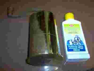 Nakładamy cienką warstwę EDELSTAHL-GLANZ (EDELSTAHL-REINIGER nazwa austryjacka) i przecieramy szmatką bawełnianą lub ręcznikiem papierowym kuchennym miękkim.