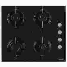 Płyta gazowa ze szkła o szerokości 60cm z 4 polami grzejnymi, emaliowanym rusztem, automatycznym systemem zapłonu oraz zabezpieczeniem przeciwwypływowym gazu.