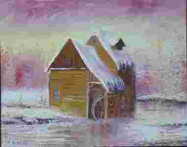 P. W.-PEJZAŻ ZIMOWY,MŁYN 40X50 OBRAZ OLEJNY
