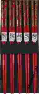 Zestaw 10 eleganckich bambusowych pałeczek, w czerwonym kolorze i motywem bambusowym. Niezastąpione dla wielbicieli kuchni azjatyckiej. Tradycja jedzenia pałeczkami sięga kilku tysięcy lat.