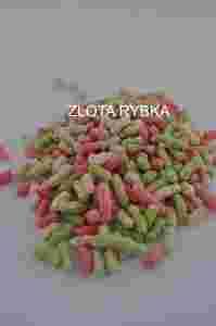 Pałeczki mix - pokarm dla karpi koi i małych ryb, składa się z 3 frakcji: zielonej-składnik roślinny zawierający spirulinę, która wzmacnia układ odpornościowy i stanowi cenne źródło białka, czerwonej zawiera naturalny czerwony barwnik wpływający na wybarwianie, beżowej naturalny składnik podstawowy.