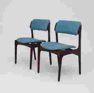 krzesła wykonane z drewna palisandrowego zaprojektowane przez Ericka Bucka model #49. Stan zachowania dobry całość odświeżona przygotowana do użytkowania, materiał obiciowy i pianki nowe dobrej klasy tkanina, konstrukcje stabilne.Cena za dwie sztuki