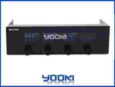 Panel wyposażony jest w ekran VFD o dużej jasności. Wyświetla informacje o temperaturze (4 czujniki termiczne) i prędkości obrotowej wentylatorów (4 kanały). Regulacja napięcia jest bardzo szeroka - od 3,7 do 12 V; Odczyt temperatury również - od 0 do 100 stopni Celsjusza. Wbudowany alarm poinformuje o wszystkich awariach układu kontrolno-pomiarowego. Interwał próbkowania układu wynosi 2 sekundy.