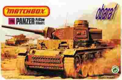 PzKpfw III (Panzerkampfwagen III) zaprojektowany przez Daimler-Benz AG, niemiecki czołg średni z okresu II wojny światowej, najbardziej dynamicznie rozwijany model służący w armii III Rzeszy, modyfikacje wprowadzone w serii Ausf. L sprowadzały się do zwiększenia czołowego opancerzenia wieży oraz zamontowania dodatkowej osłony jarzma działa i góry kadłuba, spowodowało to wzrost masy całkowitej do 22 300 kg, zostały też usunięte wizjery po bokach wieży- model firmy Matchbox w skali 1:76, w zestawie nie ma kleju i farb, model sprawdzony, ramki nienaruszone, kompletne w bardzo dobrym stanie, 2 wersje malowania i oznakowania, szczegóły widać na zdjęciach.