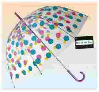 Duża przezroczysta parasolka z nadrukowanymi kolorowymi kropkami.