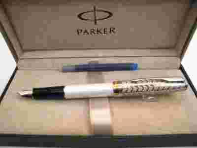 Pióro jest nowe , nie używane,kupione u jedynego generalnego przedstawiciela marki Parker na Polskę.Pióro jest zapakowane w oryginalne etui prezentowe Parkera.Grubość stalówki F-cienka.Pióro standardowo wyposażone w tłoczek.Dodatkowo: nabój startowy, gwarancja międzynarodowa 2+2 lata.