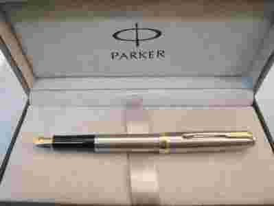 Pióro jest nowe , nie używane,kupione u jedynego generalnego przedstawiciela marki Parker na Polskę.Pióro jest zapakowane w oryginalne etui prezentowe Parkera.Grubość stalówki F-cienka.Pióro standardowo wyposażone w tłoczek Standard.Dodatkowo: nabój startowy, gwarancja międzynarodowa 2+2 lata.