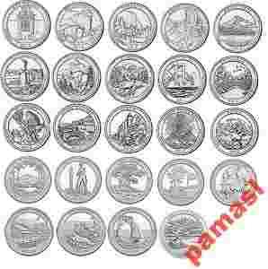 Przedmiotem aukcji jest komplet 24 wszystkich monet kolekcjonerskich o nominale 25 cent (ćwierćdolarówka) Parki USA - począwszy od 2010 Hot Springs National Park (Arkansas) po najnowszą Great Sand Dunes National Park (Colorado).
