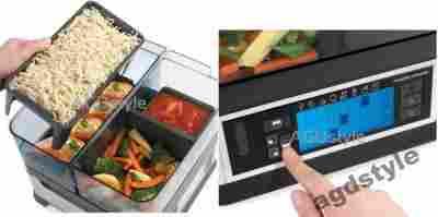 Parowar ma wbudowany czytelny i prosty w obsłudze wyświetlacz LCD oraz inteligentny timer, dzięki którym można przygotować cały posiłek na określoną godzinę. Urządzenie ma pojemność 8,2 l. Dodatkowo parowar ma dołączone trzy pojemniki – na ryż, na sos i podstawkę na ryby, co podnosi funkcjonalność w codziennym użytkowaniu.