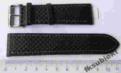 Pasek do męskiego zegarka skórzany , czarny , faktura na wierzch skóry tak jak karbonowe wykończenia we wnętrzu aut . Szerokość mocowania 24mm lub 20mm , długość paska zapiętego na ostatnią dziurkę 18,5 cm . Klamerka stalowa w kolorze srebrnym . Renomowana marka Horido .