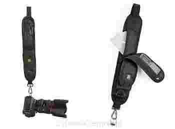 Pasek posiada bardzo wygodną regulację: wystarczy przytrzymać sprzączkę i wyciągnąć pasek na odpowiednią długość. W każdym momencie można aparat po prostu odpiąć od paska zwalniając zapięcie karabińczyka (bez potrzeby ściągania sprzętu przez głowę) i w jego miejsce przypiąć inny korpus aparatu - cała operacja zajmuje kilka sekund.