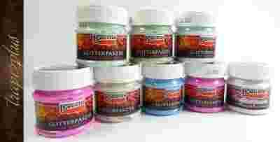 Za pomocą past zawierających mieniący się laserowy brokat, stwarzać możemy wspaniale lśniące powierzchnie. Pastę nakładać pędzlem lub szpatułką.