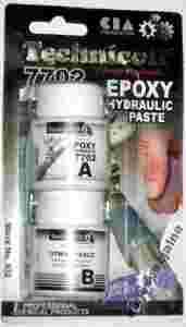 Epoxy Hydraulic jest dwu składnikowym tiksotropowym klejem na bazie żywicy epoksydowej, utwardzacza, włókien szklanych i specjalnych środków sieciujących pod wpływem wilgoci. Charakteryzuje się najwyższą adhezją (siłą przyczepności) do prawie wszystkich materiałów twardych: metali (żelaza, stali, aluminium, żeliwa, itp.), tworzyw sztucznych, szkła, drewna, kamienia, betonu, gumy itp. (z wyjątkiem polipropylenu i polietylenu, sylikonu i teflonu). SPOSÓB UŻYCIA: Należy zlokalizować miejsce wycieku, a następnie odciąć dopływ wody (w czasie klejenia woda nie może wypływać z nieszczelności ponieważ mogłaby wypłukać nie utwardzoną masę kleju). Powierzchnie przeznaczone do klejenia należy zszorstkować (np. papierem ściernym) i bardzo dokładnie odtłuścić (np. myjąc gorącą wodą z płynem do mycia naczyń). Pojemnik zanurzyć na kilka minut w gorącej wodzie, co pozwoli na łatwe wydostanie pasty. Bardzo dokładnie wymieszać obydwa składniki aż do uzyskania jednolitego koloru (do mieszania można użyć np. płaskiego wkrętaka). Bardzo dokładne wymieszanie składników jest gwarancją skuteczności pasty. Mieszanie pasty należy wykonać w dwóch etapach, używając jednorazowo połowy masy składników A+B. Jeżeli mamy wątpliwości czy proporcja składników jest odpowiednia to należy zawsze użyć mniejszej ilości utwardzacza, składnika B w stosunku do żywicy, składnika A. Nanieść warstwę pasty zwracając uwagę aby wpłynęła w szczeliny nieszczelności, jeżeli jest to np. pęknięta rura to po nałożeniu pasty aby zwiększyć wytrzymałość należy owinąć miejsce nieszczelności siatką szklaną i pozostawić spoinę na około 30 minut do wstępnego zsieciowania kleju jednak tak aby masa nie utwardziła się. Następnie wymieszać pozostałą ilość pasty i nałożyć drugą warstwę. Odczekać kilkanaście minut tak aby pasta nie spływała z powierzchni i całość podgrzać dostępnym nośnikiem ciepła (np. suszarką do włosów), wyższa temperatura znacznie skróci czas sieciowania i zwiększy wytrzymałość spoiny szczególnie podczas pracy w temperaturze np. około 80 stopni Celsjusza. Jeżeli stwierdzimy, że uszczelnienie jest już na tyle twarde, że nadaje się do obróbki mechanicznej (np. szlifowania) to uważamy naprawę za zakończoną. Prawidłowo przeprowadzona naprawa pozwala na uzyskanie spoiny, która wytrzyma ciśnienie wody w rurociągu przekraczające 40 atmosfer i pracę w temperaturze do 80 stopni Celsjusza.