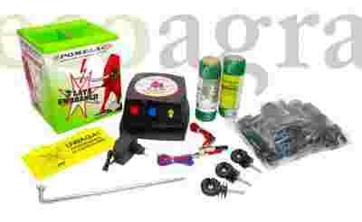 sieciowo-akumulatorowy firmy Pomelac. W zależności od potrzeb, można go zasilać z sieci 220V lub z akumulatora (akumulator nie wchodzi w skład zestawu). Urządzenie genruje impuls o energii równej 400mJ, co jest wartością wystarczającą, aby