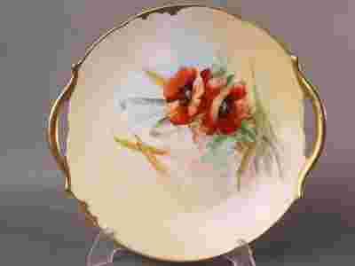 Cudowna patera dekorowana przez najwspanialsze studio zdobnicze PICKARD, skupiające najznamienitszych artystów ówczesnego okresu. Prace artystów z tego studia osiągają zawrotne ceny na całym świecie... Dekoracją jest bukiet z prześlicznych czerwonych maków polnych z uroczymi czarnymi pręcikami i żółte, dojrzałe kłosy zboża. Tło delikatne, pastelowe w odcieniach żółtego, błękitu i subtelnej brzoskwini. Uchwyty i brzeg patery wykończone złoceniem. Niezwykle piękna dekoracja, ukazująca nawet najdrobniejsze szczegóły polnego bukietu!!!