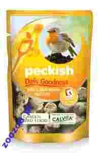Peckish Daily Goodness Wysokoenergetyczna mieszanka dla dzikich ptaków. Mieszanka składa się z kulek tłuszczowych z dodatkiem nasion i suszonych owadów. Do stosowania w okresie zimowym. Zrelaksuj się, patrząc na pełne życia ptaki, i ciesz się ich radością. Daily Goodness zawiera tłuszcz, nasiona i specjalnie preparowane owady, aby zapewnić ptakom wysokoenergetyczny pokarm, którego potrzebują szczególnie w okresie zimy. Ciesz się obecnością w Twoim ogrodzie takich ptaków, jak: kos, modraszka, szczygieł, gil, zięba, sosnówka, rudzik, bogatka. Jak używać: Wsyp kulki to karmnika lub rozłóż na stole albo na tacy, na których dokarmiasz ptaki. Kulki można też rozłożyć bezpośrednio na ziemi. Wzbogacone naturalną substancją CALVITA Calvita to unikalna formuła, która zawiera niezbędne dla zdrowia ptaków uzupełniajace składniki odżywcze, trudne do pozyskania w okresie zimowym. CALVITA zapewnia ptakom lepsze zdrowie i piękny wygląd. KAROTENOIDY - Potrzebne są dla ładnego wybarwienia piór. Chronią pióra przed szkodliwym działaniem promieni słonecznych. WAPŃ - Wzmacnia kości. Niebędny składnik skorupek ptasich jaj. WITAMINY A, D, E i BIOTYNA - Wzmacniają dzioby i kości. Wspomagają zdrowy rozwój i rozmnażanie. Higiena Zapewnij ptakom dostęp do czystej i świeżej wody. Czyść karmniki i miejsca karmienia regularnie, używając delikatnych środków czystości. Przechowuj pokarm czysty i suchy. W wilgotnych mieszankach mogą rozmnażać się szkodliwe grzyby, bakterie i wirusy. Przechowywanie Mieszanka nie jest przeznaczona dla ludzi. Zawiera orzechy. Przechowuj w suchym i ciepłym miejscu z dala od dzieci. Zużyj w ciągu 3 miesięcy od otwarcia opakowania. Mieszanka paszowa dla dzikich ptaków. Skład: mąka pszenna, łój wołowy, mąka z orzeszków ziemnych, proso białe i czerwone, rzepak czarny, siemię lniane, preparowane owady, calvita. Wilgotność < 10%. Watrość energetyczna – 528 kcal/100g. Popiół surowy - 0,9%; włókna surowe - 0,6%; tłuszcz surowy - 30,0%; białko surowe - 11,0%.