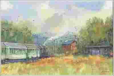 PEJZAŻ Z ODJEŻDŻAJĄCYM POCIĄGIEM --- Akwarela.