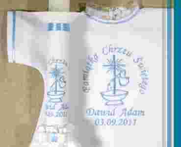 Częścią stałą jest znak graficzny i napis "Pamiątka Chrztu Świętego" wokół. W hafcie zmienne są imiona i data.