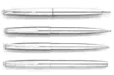 Klasyczny model Parkera produkowany od 1960 roku. Oferowany egzemplarz to wersja z korpusem i zatyczką ze stali, tzw. "Flighter" z chromowanymi wykończeniami. Wyprodukowane w Anglii, brak kodów oznaczających datę produkcji na piórze, ołówku i mazaku, a na długopisie kod "AE" (I kwartał 1982 roku).
