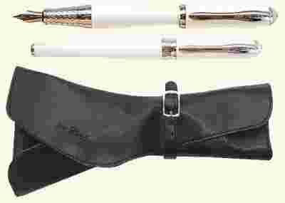 Eleganckie pióro sprzedawane w skórzanym etui, ze względu na wielkość i kształt,