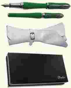 Eleganckie pióro sprzedawane w skórzanym etui, ze względu na wielkość i kształt,