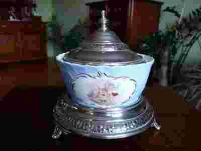 Przedmiotem licytacji jest bardzo ładna , zabytkowa bomboniera . Bombonierę wykonano w stylu secesji na przełomie XIX/XX w . Bomboniera nie jest sygnowana ale jej forma i zdobienia wskazują , że jest to wyrób śląski . Wkład bomboniery jest porcelanowy . Zdobią go scenki rodzajowe z amorkami . Scenki różnią się między sobą . Zdobienia wykonano naprawdę starannie . Powierzchnia bomboniery jest dodatkowo zdobiona ozdobnymi reliefami . Pokrywa i podstawa przedmiotu są metalowe . Części metalowe są także bardzo dekoracyjne . Zostały one starannie wypolerowane i prezentują się doskonale . Całość robi naprawdę doskonałe wrażenie . Stan zachowania przedmiotu : bardzo dobry . Nie ma żadnych pęknięć czy ubytków . Zdobienia dobrze widoczne . Widoczne jedynie przetarcia złoceń na krawędzi przedmiotu . Elementy metalowe bez zarzutu , nie mają ubytków czy przetarć . Bombonierka jest naprawdę ładna i prezentuje się doskonale . Polecam .