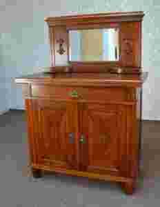 Lustro jest oryginalne i fazowane. Widać w kilku miejscach braki srebra ale nie wpływa to na jakość a raczej podkreśla antyczny charakter całego mebla. Na uwagę zasługuje fakt, że zachowane zostały oryginalne okucia pokryte naturalną patyną. Konstrukcja mebla jest sztywna i stabilna. Zamki są sprawne a w komplecie są dwa mosiężne klucze. Mebel jest w stanie idealnym – po renowacji nie był używany.