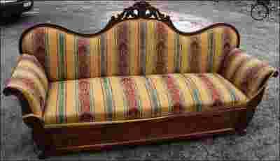 Przepiękny mebel z wysuwaną skrzynią. Mebel z XIX w. zdobiony piękną snycerką. Bogato profilowane i zdobione boki mebla wykonane z drewna. Renowacja tapicerki wykonana kilka / naście lat temu w bardzo dobrym stanie. Jedynie taśma tapicerska odkleiła się od stelaża. Wielu mogłoby podjąć decyzję, że mebel są gotowi wstawić do użytku tylko po przyklejeniu taśmy.