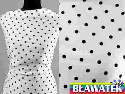 Przedmiotem aukcji jest piękna satyna w czarne groszki na białym tle. Tkanina jest bardzo miła w dotyku, ładnie się nosi i układa, delikatnie połyskująca, cienka.